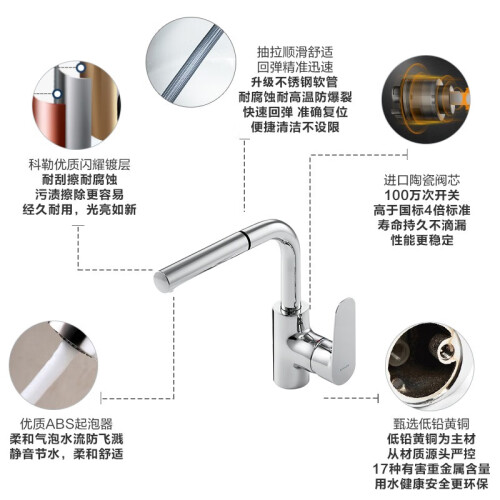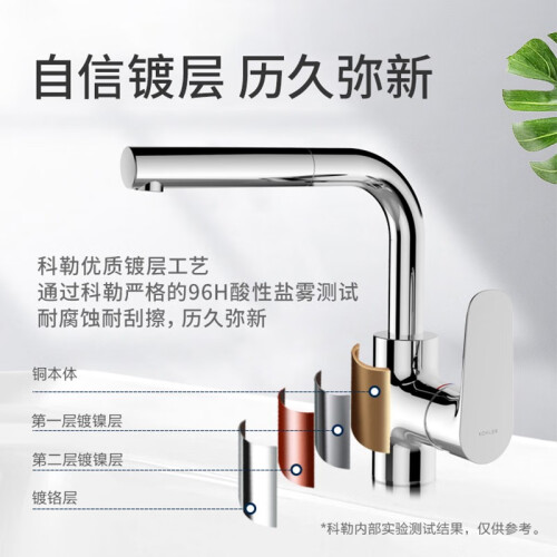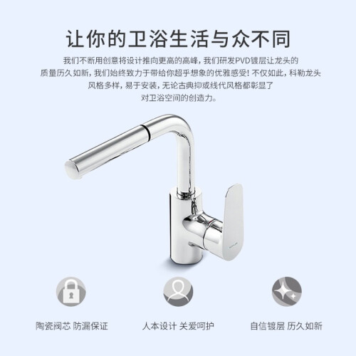 科勒(KOHLER)这款抽拉式面盆龙头,多方位抽洗设计,能自由掌握出水角度,方便多角度清洁。搭配出水口起泡器,有效隔离水中杂质,出水柔和,防止喷溅。阀门采用陶瓷阀芯,耐高温且不易渗漏滴水。表面采用科勒镀层工艺,通过盐雾测试实验,耐刮擦不易腐蚀。