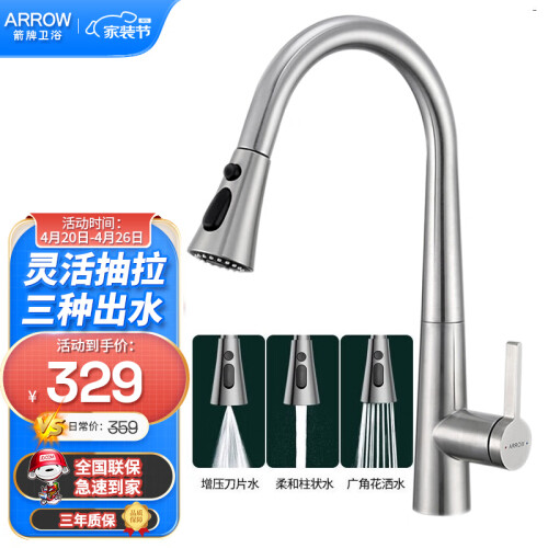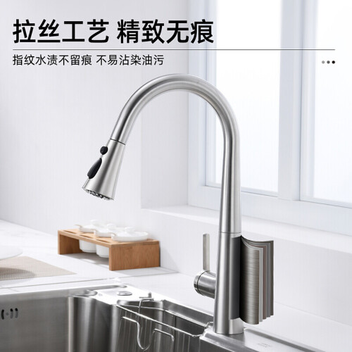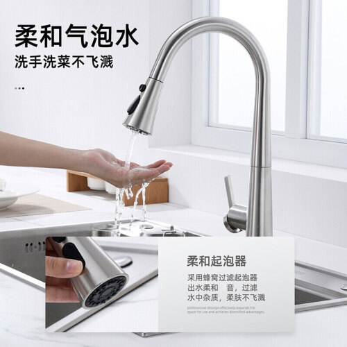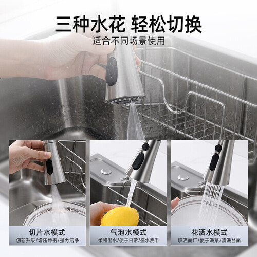 该款龙头,选用304不锈钢材质,冷热出水,360°旋转,0-60cm加长抽拉范围,单双槽均适用,单把控制冷热水温,支持气泡式、花洒出水模式,更有新升级切片水模式,水流更强劲有力,清洁力更强。