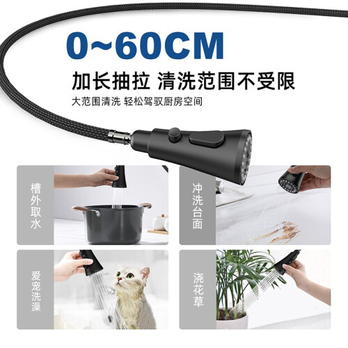 0-60CM,加长抽拉清洗范围不受限,大范围清洗轻松驾驭厨房空间。冷暖双控水温可调,四季都能拥有最适合自己的水温,拒绝冬日刺骨水。