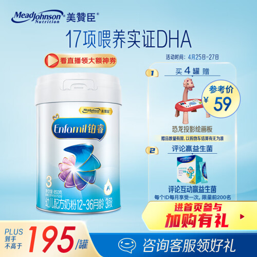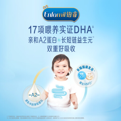美赞臣成立于1905年,拥有百年历史,是美国市场的销量冠军,也是最早进入中国市场的进口奶粉品牌之一,旗下已有蓝臻、安儿宝、铂睿、亲舒等多个奶粉品牌。这款铂睿系列主打的卖点是添加国际权威的优量DHA和独特益生元组合,DHA被人们誉为“脑黄金”,对大脑和视力发育起着重要作用,添加PDX+GOS益生元组合,PDX长链益生元,作用于整个大肠,GOS短链益生元,作用于大肠前端,二者协同维护宝宝肠道健康,增添肠动力。除了以上提到的两大配方特色之外,奶粉中添加营养学建议水平的胆碱和牛磺酸,有助脑发育和神经发育,丰富的蛋白质和钙、铁等矿物质及多种维生素,满足成长所需。