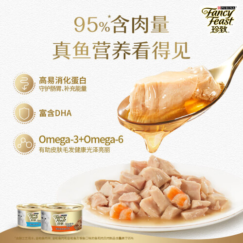 这款珍致 猫罐头选用天然优质食材,肉块看得见,味道鲜美,适口性强,猫咪爱吃,科学配方,均衡营养,美味诱惑。高蛋白质有助于爱猫毛发亮泽,柔顺,提供爱宠日常所需能量。4种口味组合,可每日更换口味。