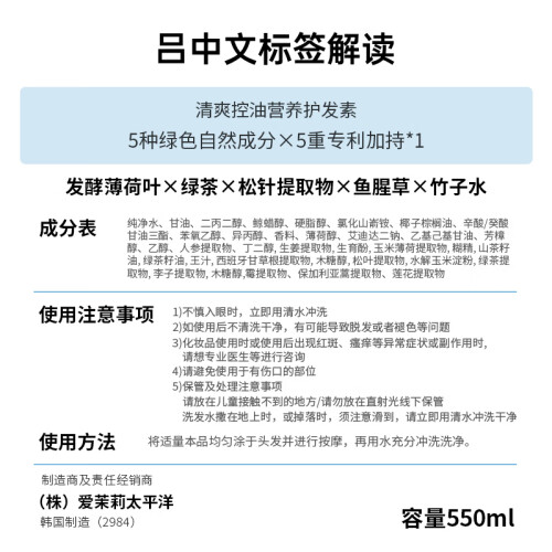 吕是韩国爱茉莉集团的中高端洗护品牌,所有洗护系列均以汉方为基础,具有防脱发功效。 这款Ryo 绿吕 控油去屑护发素,是由老款蓝吕和绿吕配方升级合并而来,主打去屑滋养,镇定头皮和控油的特点,滋养强化发根,润发的同时令头发轻盈,特别适合油性发质使用。规格:500ml。
