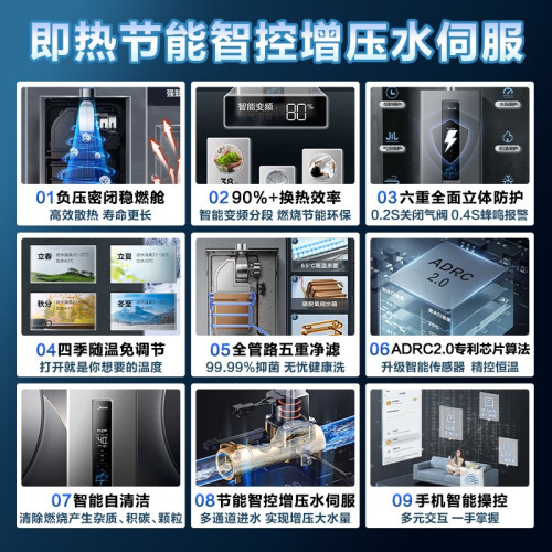 美的增压水伺服燃气热水器RF3系列,增压恒温水伺服,智感温节能省气,高清控制面板,高清LED清晰显示,灵敏触屏感应,机器运行状态即时掌握,功能模式一目了然,动态恒温,灵活控水,智控增压水伺服新纪元,双通道进水,打破传统恒温芯片限制,增容不限流,ADRC2.0用水自适应恒温算法,动态用水环境中精控恒温,保持舒适肤感水温,自适应多场景,节能变频燃烧,燃气使用一目了然,智能匹配,分段燃烧,变频节能,一年四季免调温,智温感更懂你的温度,智能云管家,多元交互,健康抑菌洗,亲肤更健康,有效预防CO超标,恒温沐浴更安全,智能开机自检,6大安防全程无忧沐浴,抗风稳燃,恒温安全。