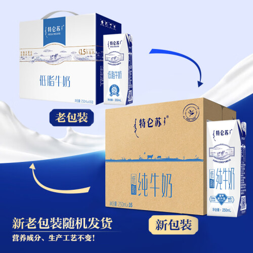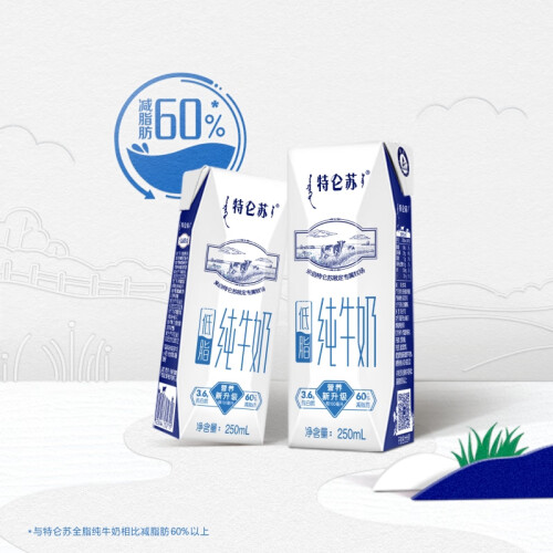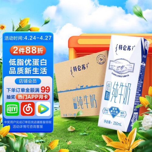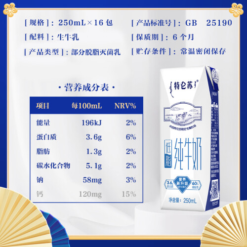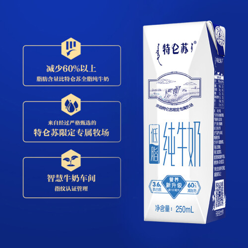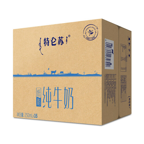 蒙牛是蒙牛集团旗下主力品牌,于1999年成立,总部位于中国内蒙。蒙牛品牌主打液体奶、冰激凌和其他乳制品等产品。蒙牛旗下有特仑苏、未来星、焕轻、优益C、冠益乳、酸酸乳及纯甄等品牌。这款蒙牛特仑苏低脂牛奶,低脂优蛋白,健康新贵族。特仑苏低脂牛奶富含优质乳蛋白,每100ml牛奶中蛋白质含量高达3.6g,含脂肪4.4g,脂肪含量比全脂灭菌纯牛乳减少50%以上。 规格:250ml*16包。