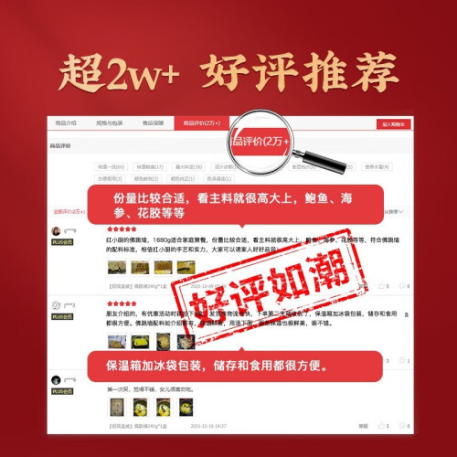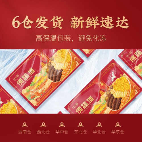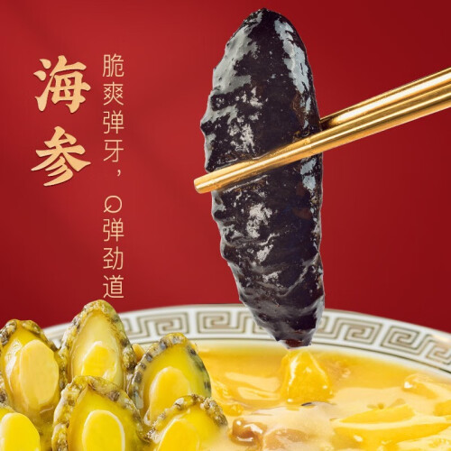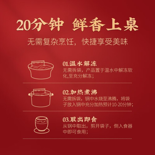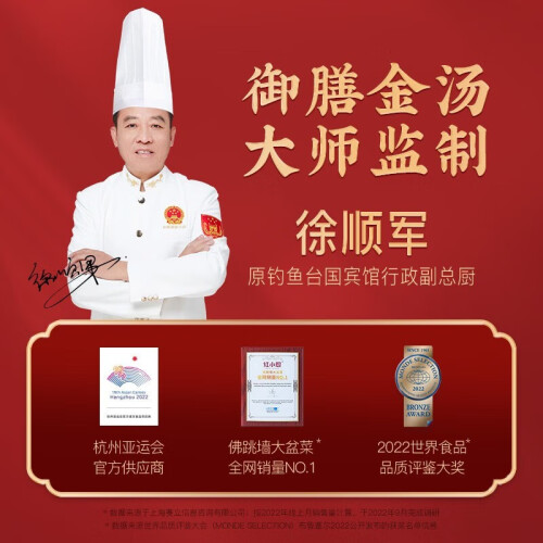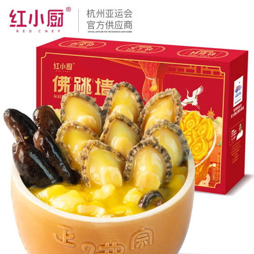 红小厨是生鲜行业的新锐品牌,2022年杭州亚运会官方供应商。这款佛跳墙由老鸡与新鲜鸡胸肉搭配猪扇骨熬煮,熬制出色泽诱人的鲜美金汤, 搭配鲍鱼、海参、干贝、杏鲍菇、香菇、蹄筋、鱿鱼、花胶、海螺等制成。无需复杂烹饪流程,温水解冻后,无需拆袋,放入锅中充分加热8-10分钟,即可食用。规格:1680g。