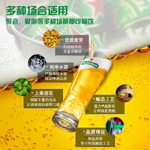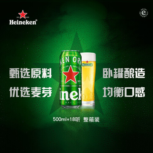 Heineken喜力是一家荷兰酿酒公司,在阿姆斯特丹创建,是世界最大的啤酒出口商。在国内也是大家比较熟悉的国外啤酒品牌,一般喝到的也都是国内生产的。这款喜力啤酒原料只采用水、麦芽、啤酒花酿造而成,亮点是喜力A级酵母独家使用,令啤酒更精纯细滑,口感平顺甘醇,原麦汁浓度11.4°P,酒精度5%vol。规格:500ml*18听。