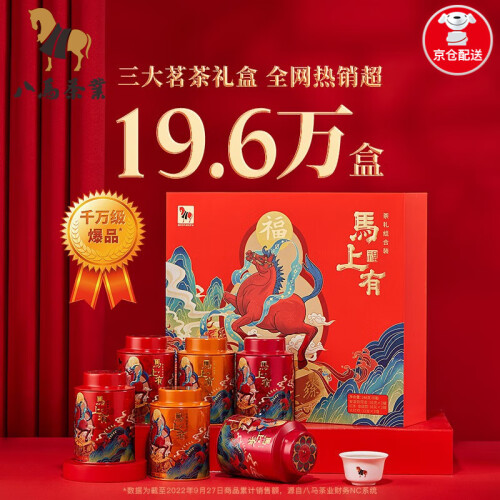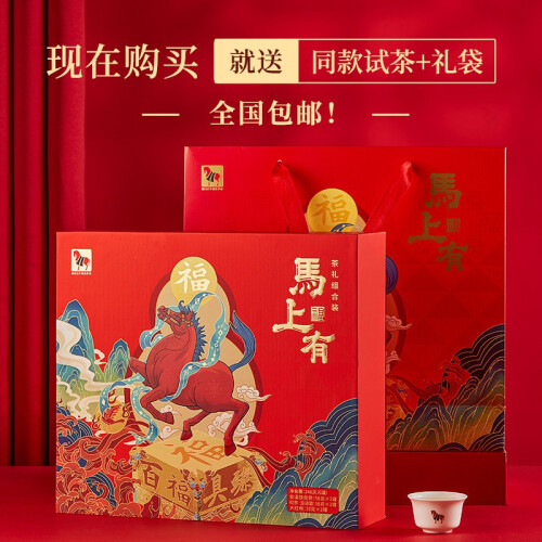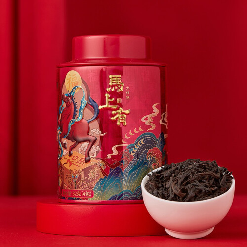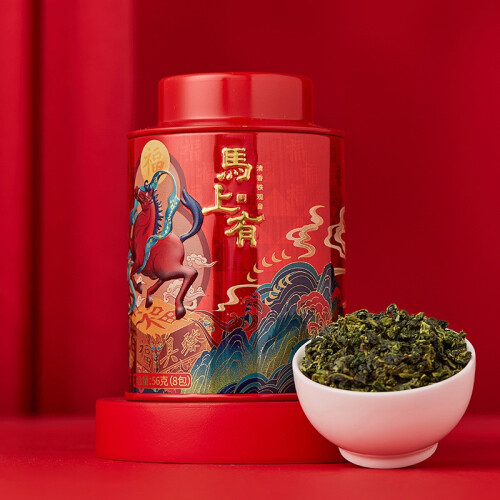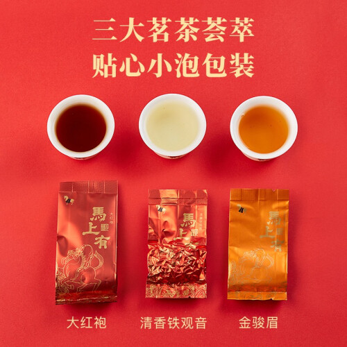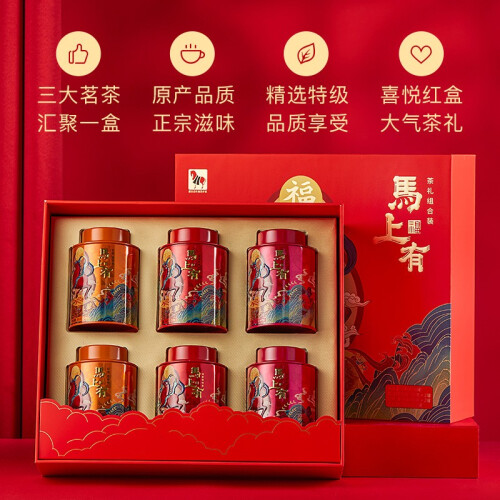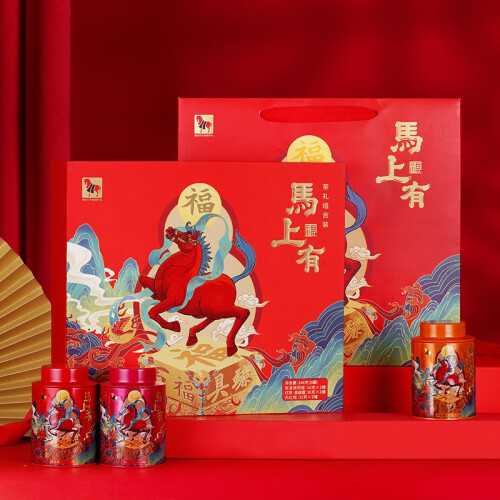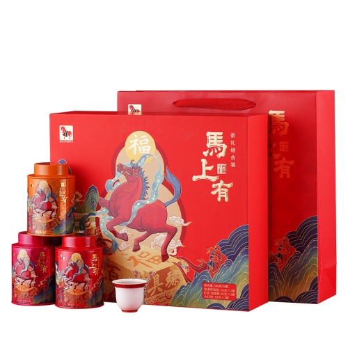 国潮茶礼,马上有福,缤纷组合,一盒三味,三款茶类,铁观音兰香雅韵,红茶金骏眉蜜甜醇香,武夷岩茶大红袍岩骨花香韵味浓,满足不同口感人群需要;喜庆大红礼盒,寓意鸿运当头;骏马腾空,福礼将至。马上有福礼,马上喝好茶。三色彩罐,小巧精致;独立小泡装,干净便捷,自饮送人均福韵满满。规格:248g。