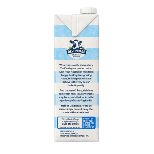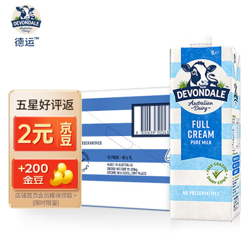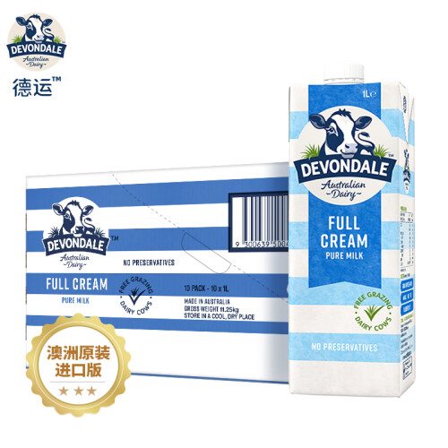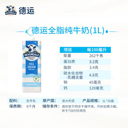 1950年成立的Murray Goulburn公司至今已是澳洲的乳制品生产商,从1972年开始推出DEVONDALE德运品牌牛奶,这款Full Cream全脂牛奶(1L装)富含钙、蛋白质和维生素A等10种营养素促进身体健康及强壮骨骼,产品经澳大利亚心脏基金会核准,无防腐剂。规格:1L*10盒。
