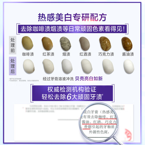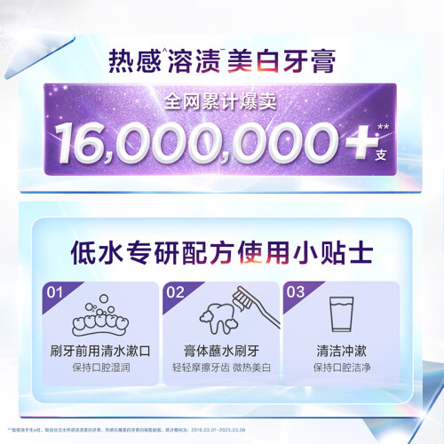 这款3D热感美白牙膏,特含牙膏界“烟酰胺”溶解牙渍,泡沫细腻易冲漱。牙膏采用的MICROHEAT微热技术,使得刷牙时产生热感,有效软化顽固牙渍,而含有的Glass-H美白粒子也可以针对外源性着色进行有效去除。
