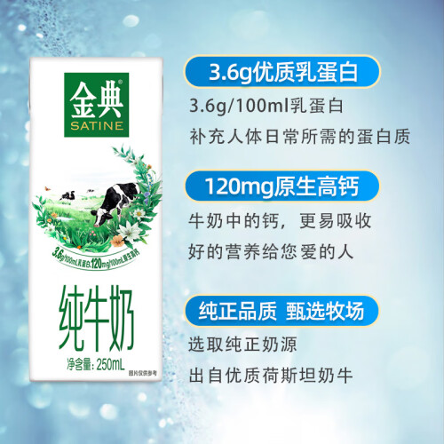 金典牛奶诞生于2006年,作为伊利液体奶的首个高端副品牌;自上市起,即秉承奉献最佳品质的理念,致力打造中国“最好的牛奶”,金典有机奶唱享健康有机新生活,蛋白质含量比灭菌乳国家标准最低要求增加27%,滴滴醇正,口感醇香,奶味十足。