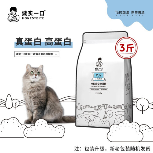 诚实一口P32猫粮粗蛋白高达32%,68%肉含量,采用冻鸡肉,鸡肉粉以及三文鱼等制作而成,不添加谷物豆类,呵护猫咪肠胃,不添加诱食剂,原料可追溯。