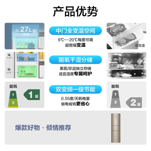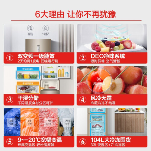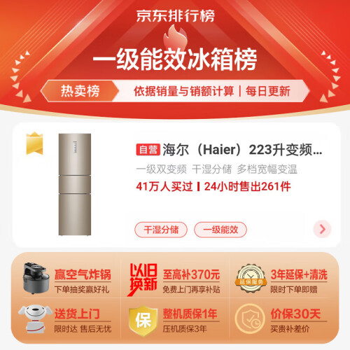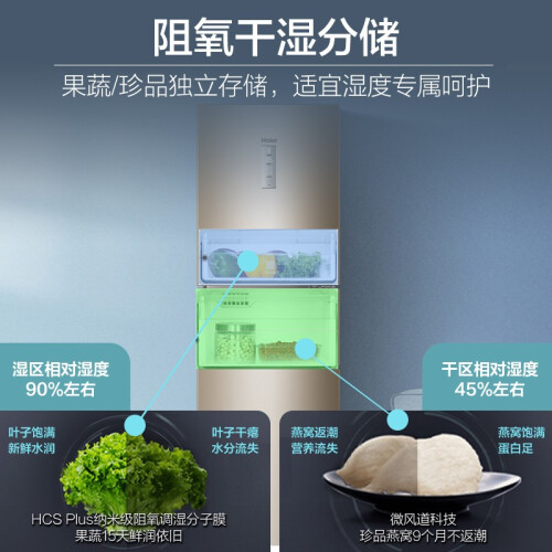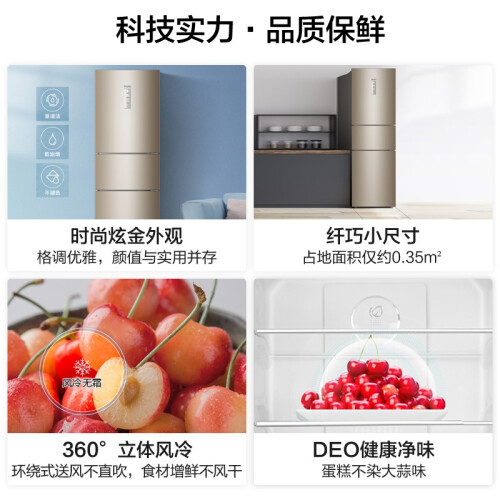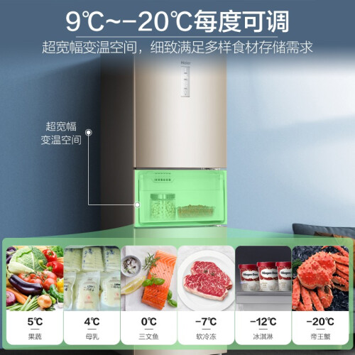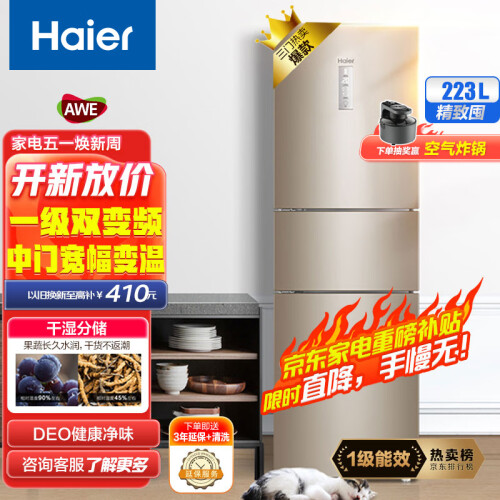 Haier 海尔 BCD-223WDPT 三门冰箱,223L容量,干湿分储,风冷无霜。采用变频电机,静音环保。DEO净味除菌技术,能够有效吸附食物异味。5.5KG/12h冷冻能力。从上到下分区容量分别对应119/33/71L。