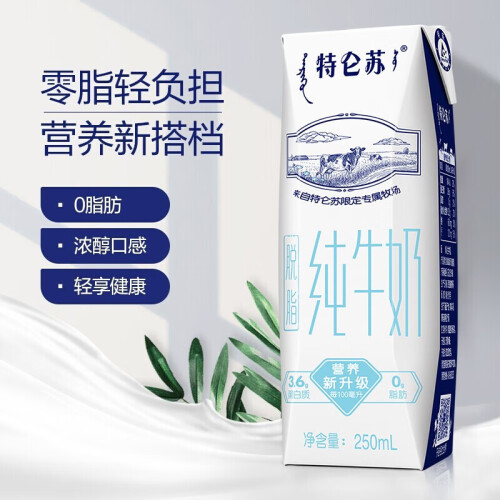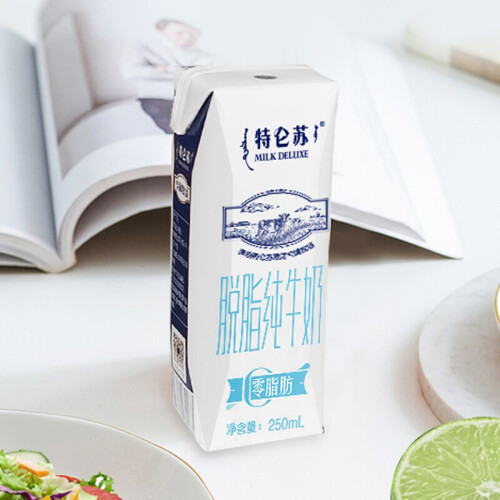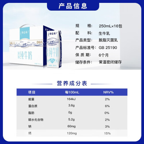 特仑苏的这款脱脂纯牛奶,属于脱脂灭菌乳。配料选用生牛乳,每100g里含有能量164KJ、蛋白质3.6g、钙120mg,满足人体营养需求。0脂肪,轻负担。奶香浓郁,奶质醇香自然,口感绵密,味道醇厚。适用于一般人群,或轻食主义者和健身人群饮用。250ml纸盒包装,方便携带,即开即饮。保质期6个月,常温密闭保存,开启后立即饮用。