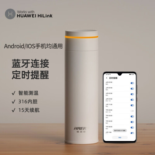 这款智能保温杯,触碰瓶盖即可测温,慢反射灯带提醒水温,避免水温过高烫伤。蓝牙链接手机APP,实时显示水温和饮水记录。触摸杯盖顶部,杯盖会根据当前水温状况发出不同颜色的灯光,提醒当前水温状况。内胆选用医用级316不锈钢,相比传统304不锈钢更加健康卫生,杯盖更是开创性使用了食品级接触级Tritan材质。全天候24小时保温。规格:500ml