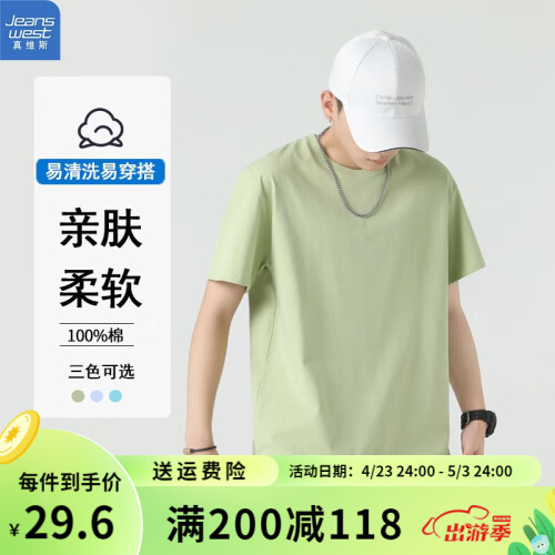 JEANSWEST 真维斯 男士短袖T恤 显瘦有型,吸湿吸汗,柔软舒适,宽松休闲,自然肩线修饰身形,柔软亲肤面料光洁细腻,干爽透气休闲百搭,植物纤维蓬松柔软手感好,透气滑爽抗皱悬垂性佳。