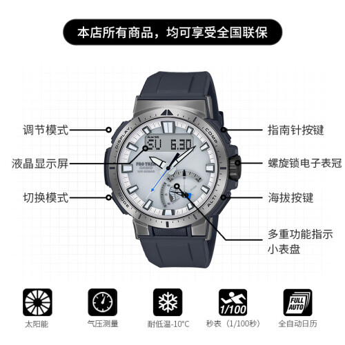 此款产品为CASIO 卡西欧 PRO TREK 户外大师系列 男士太阳能电波腕表 PRW-70-7,该表在设计中以多种实用性能令PRW-7O的应用场景得到了更大的扩展山脉、河流和海洋等环境都可以胜任。图形全数字大表盒,液晶盘的双显设计搭配霓虹背光灯,随时随地捕捉此刻时,间以及功能信息。采用大号防滑按钮,便于户外操作提升实用便捷性。轻质的钛金属表带通过碳化钛的特殊处理,增强手表的耐磨性。