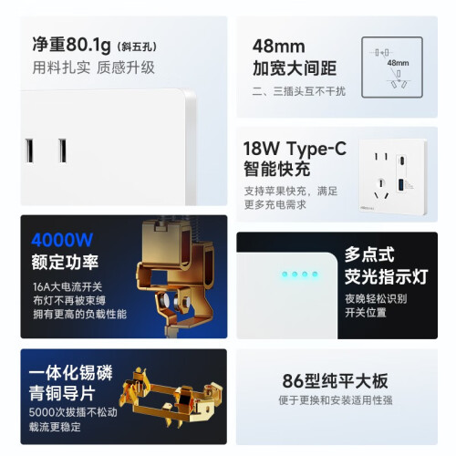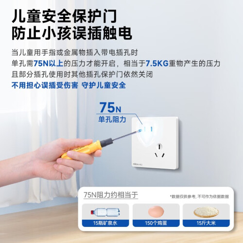 4000W额定功率,16A大电流开关,布灯不再被束缚,拥有更高的负载性能。一体化锡磷青铜导片,5000次拔插不松动,载流更稳定。当儿童用手指或金属物插入带电插孔时,单孔需75N以上的压力才能开启,相当于7.5KG重物产生的压力且部分插孔使用时,其他插孔保护门依然关闭。