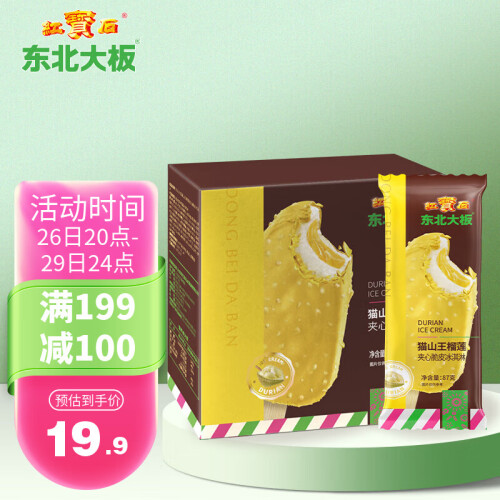 东北大板 榴莲脆皮冰淇淋,榴莲内芯选用马来西亚猫山王,自榴莲老树,口感细腻绵香。规格:87g*5支 。