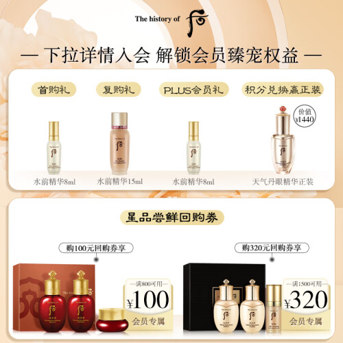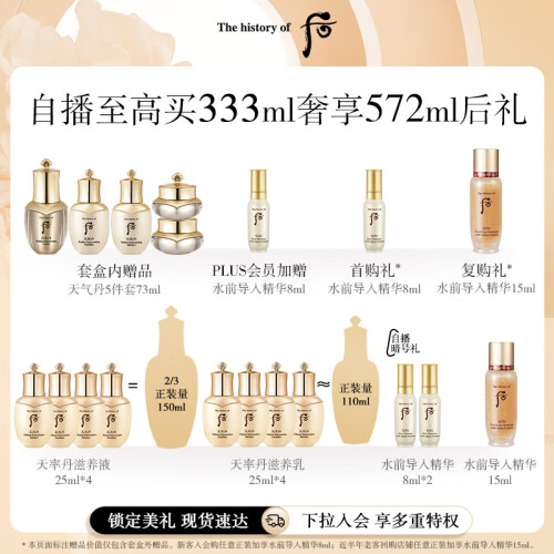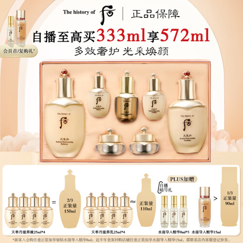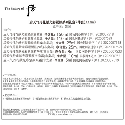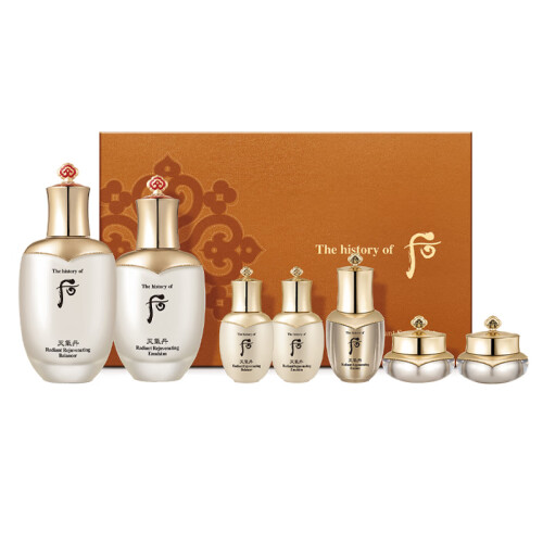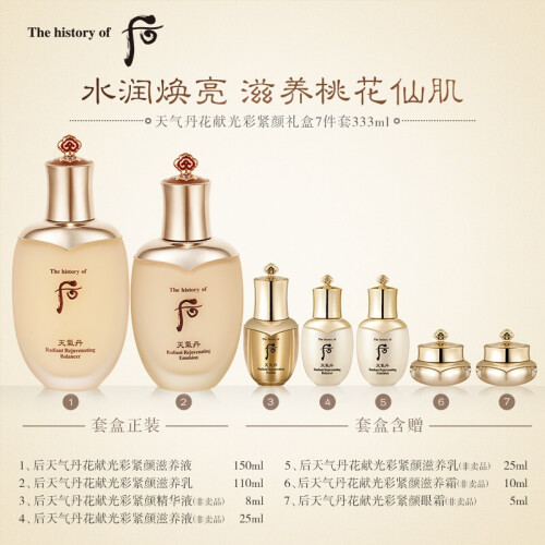 WHOO后的高端系列,水乳霜六件套,套装包含:天气丹花献光彩紧颜滋养液 150ml,天气丹花献光彩紧颜滋养液 25ml,天气丹花献光彩紧颜精华液 8ml,天气丹花献光彩紧颜滋养乳 110ml,天气丹花献光彩紧颜滋养乳 25ml,天气丹花献光彩紧颜滋养霜 10ml;较适合25岁以上的任何年龄任何肤质女性,汇集韩国宫廷美颜秘方,主要成分有山参玉珠、鹿茸粉骨、黄金朱木等成分,补水保湿、抗氧抗皱,改善肌肤干燥。每件瓶口采用按压式设计,可控制用量。保质期3年,如敏感型肌肤,可先小范围使用。
