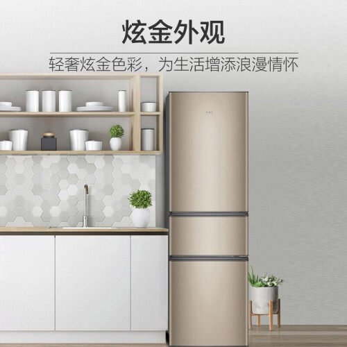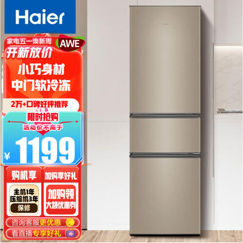 海尔216L时尚中门软冷冻家用冰箱,容量216L,冷藏室124L,软冷冻室35L,冷冻室57L,炫金外观,007软冷冻,独立三温区,节能静音,低温补偿,冷藏、软冷冻、冷冻三温独立保鲜,健康不串味,全家美食各得其鲜,纤薄小机身,无需量尺寸,放到哪里都与“屋”无争,优质压缩机,强效制冷,36分贝静音节能,为你的生活精打细算,静享健康鲜生活,