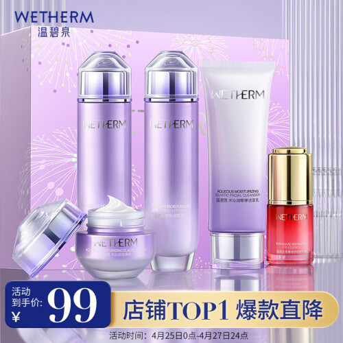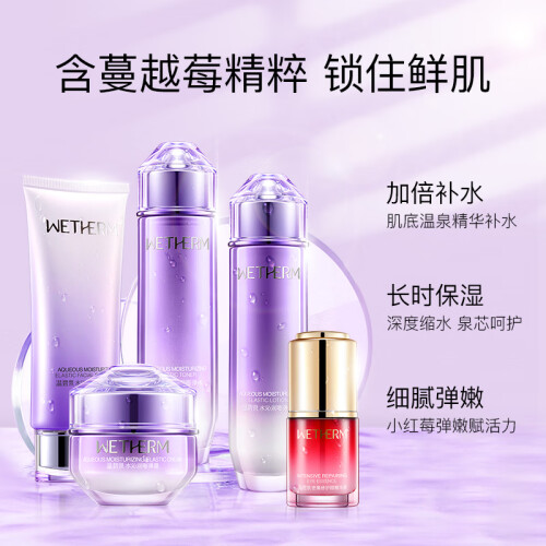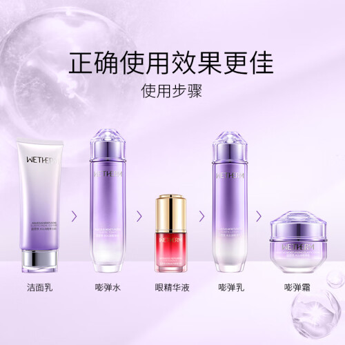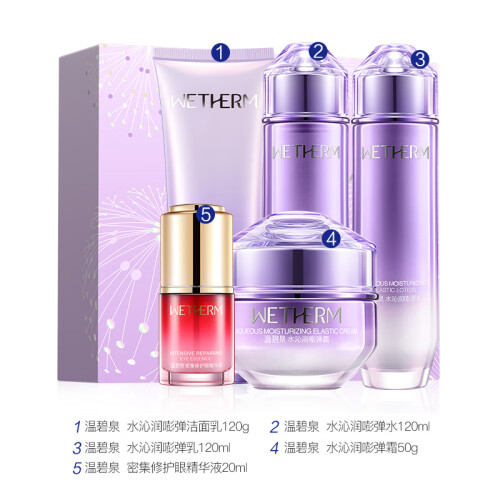 温碧泉(WETHERM)推出的这款护肤礼盒装,内含洁面乳、水、乳、霜和眼精华五款。洁面乳帮助清洁肌肤,使用后不紧绷。水沁润嘭弹水有助于后续产品吸收。沁润嘭弹乳帮助肌肤补充水分。沁润嘭弹霜可深层锁水,保湿滋润肌肤。眼精华添加温泉矿物精华和生物糖胶的成分,可改善眼周肌肤细纹,令肌肤平滑透亮。