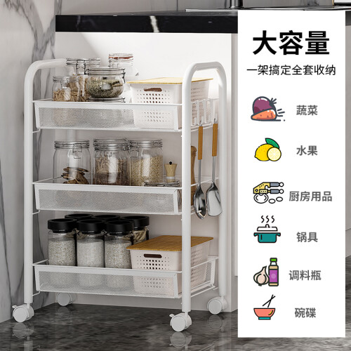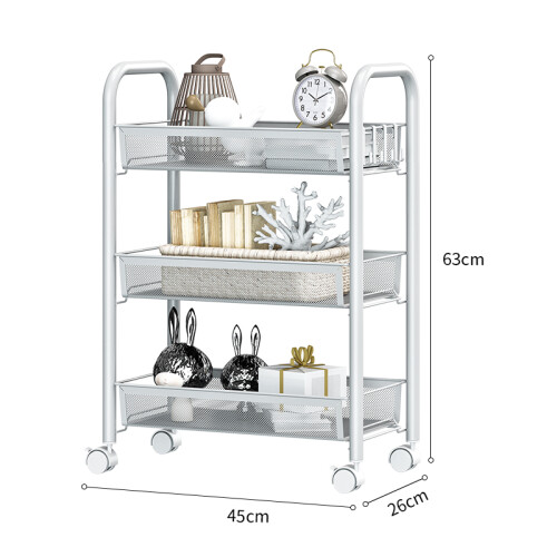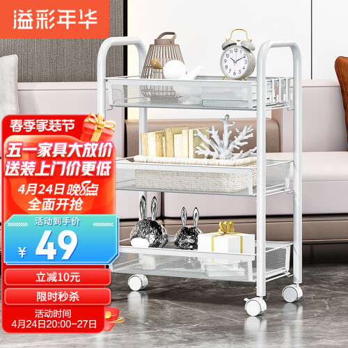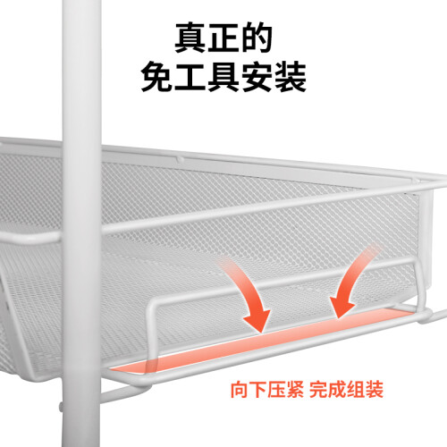精选碳钢材质,坚固耐用,久用不易生锈。层层递进,大小物件分类摆放,提高空间利用率。透气网篮,可拆下独立使用。静音滑轮,360度万向滑轮,灵活移动,稳固耐磨,带刹车装置,可以固定放置。耐摩不损伤地板,方便清洁打扫。