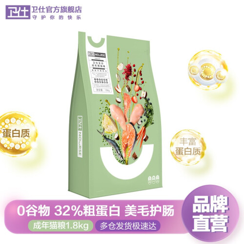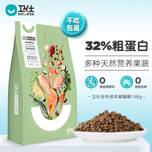 NOURSE 卫仕 全价成年猫粮 牛肉三文鱼 1.8kg,主要成分有:鱼粉、鸡肉粉、牛肉骨粉、鱼(三文鱼、沙丁鱼)、豌豆、红薯干等等,粗蛋白质≥32%。无谷低敏易消化,不含玉米、小麦、麦麸等谷类。无化学合成着色剂,食品用香料等诱食物质。