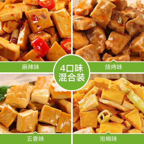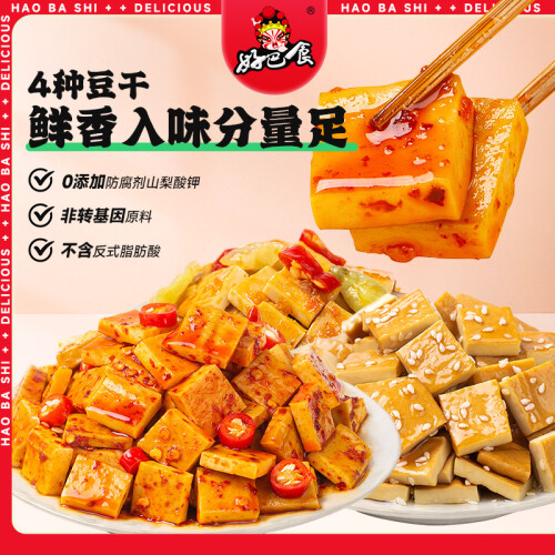 豆干富含人体三大供能物质——蛋白质、脂肪、碳水化合物,还含有钙、磷、铁等多种人体所需的矿物质,适合休闲加餐。这款好巴食豆腐干混合装由四川徽记食品股份有限公司生产,由大豆、植物油、泡椒、泡生姜、红糖等原材料制成。有五香、烧烤、麻辣、泡椒四种口味,鲜香可口,口感筋道。规格:400g/包。