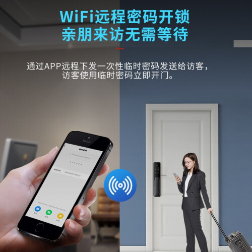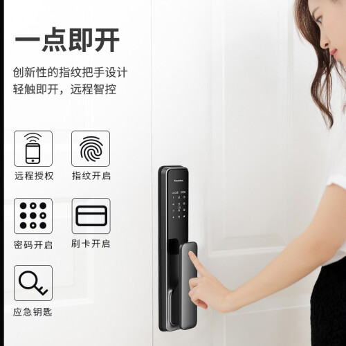 此款智能锁采用航空金属材质,尽显科技质感,沿袭经典IML外部工艺,耐磨防刮花,长久使用耀目如初。采用Cortex- M4强大内芯,识别速度快。 采用全自动锁体,一键开启儿童锁,具有5种开锁方式。指纹传感器位于推拉把手处,解锁时拇指自然下落,在指纹识别处,解锁与开门几乎同时进行,推门即进。通过APP远程发临时密码发送给访客,访客使用临时密码立即开门。