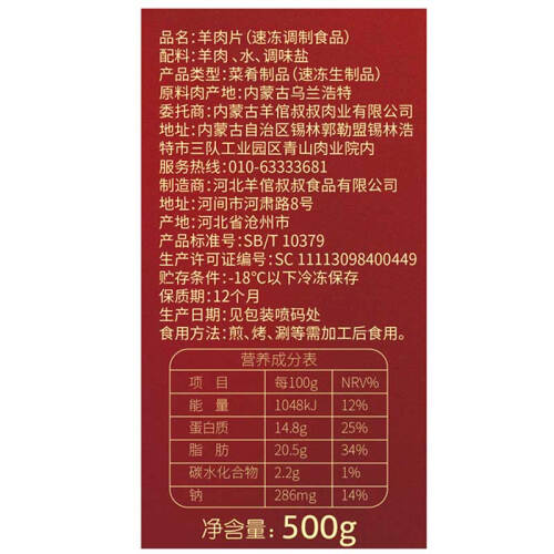 羊倌叔叔羊倌叔叔乌兰浩特火锅烤肉羊肉卷 500g