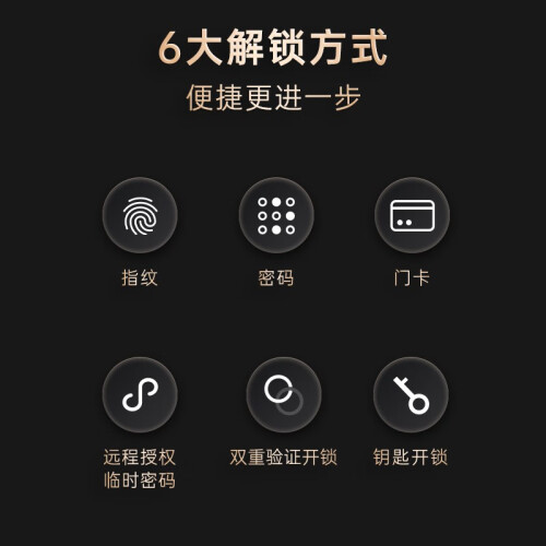 具有指纹开启、密码开启、远程授权临时密码、CPU卡片解锁、机械钥匙开锁、双重组合验证开启6种开锁方式,满足一家人的不同需求。