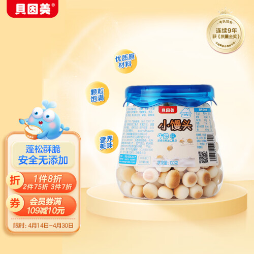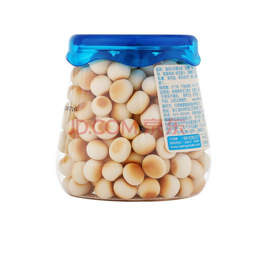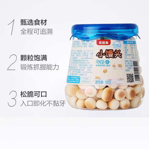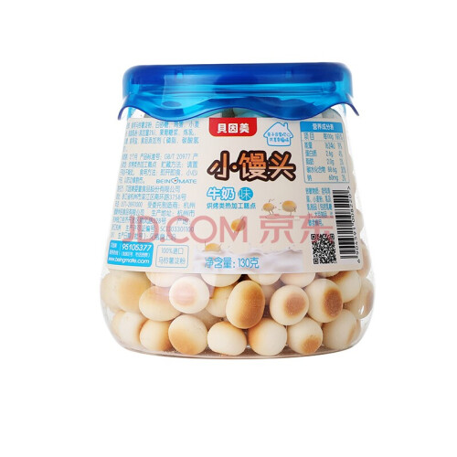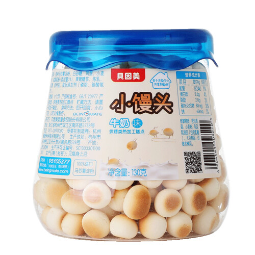 贝因美(Beingmate)推出的这款小馒头饼干,选用食用马铃薯淀粉、白砂糖、鸡蛋、小麦粉、脱脂乳粉等配料制成。饼干造型为迷你小馒头,颗粒饱满,大小适中,能锻炼宝宝的抓握能力和咀嚼能力。口感细滑,入口即溶。密封罐包装,方便拿取和携带。