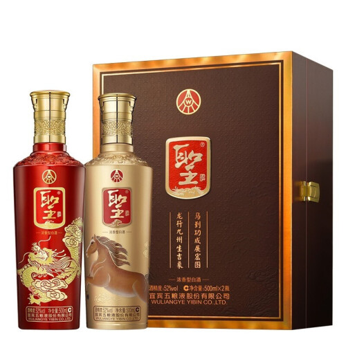 圣酒是宜宾五粮液股份有限公司出品,精选五种粮食,秉承数百年传统工艺,精心酿造而成,品质卓越;为传承中华传统“圣”文化,传播“向崇高者献礼,为成功者喝彩”的消费理念而推出的精品。龙的尊贵,认为它是唯一能代表天子的神秘动物,寓意为吉祥如意、刚健有为,是中华民族共同信仰的伟大图腾。而马则也是中华民族喜爱的动物之一,人们称赞它的善跑、忠诚、勤劳与聪灵,认为它是生活、战争中必不可少的宠儿。龙行九州生吉象 马到成功展宏图 ,酒液澄澈口感醇厚,入口绵柔细腻爽净,余味悠长浓香突出,整体协调丰满。 包装华丽不失大气。规格:500ml*2瓶
