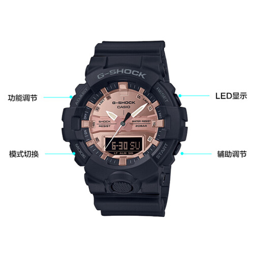 这款运动手表设有立体单显大表盘设计,给人以牢固结实的质感,指针盘搭配液晶盘的双显设计,彰显个性。表身设有多功能防滑大按键,多重功能便捷操作。表带是树脂多空表带,随意调节,方便佩戴,表扣经久耐用。手表可达200m超深防水,另外还设有LED照明、多功能闹铃、全自动日历等多种功能。表径为48.6mm。