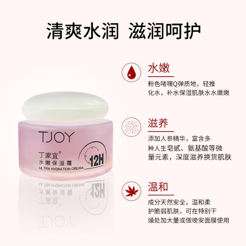 丁家宜(TJOY)这款水嫩保湿霜,添加人参精华,富含多种人参皂苷、氨基酸等微量元素,深度滋养焕活肌肤,持续补水保湿,舒缓肌肤泛红、干燥等问题,令肌肤水润嘭弹。粉色啫喱质地,轻推化水好吸收。