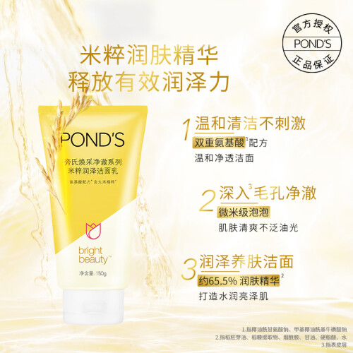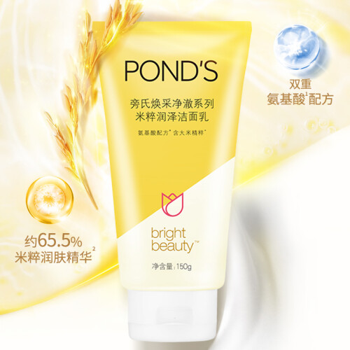 POND'S旁氏这款亮采净白系列米粹润白洁面乳,蕴含大米精粹及旁氏专属的美白配方,在深层洁净肌肤的同时提亮肌肤,也有一定滋润补水的功效,规格150g。