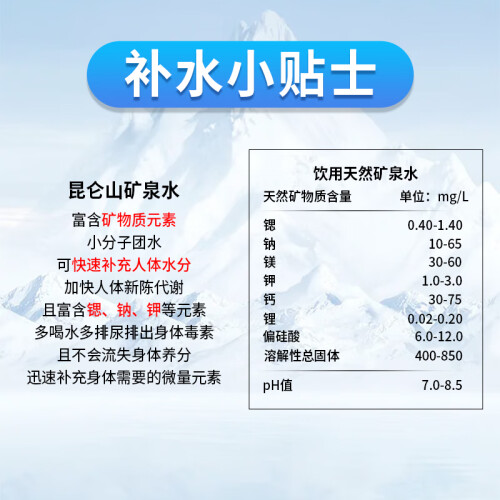 昆仑山矿泉水有限公司旗下矿泉水品牌,隶属加多宝集团。主打昆仑山雪山矿泉水,昆仑山雪山矿泉水来自青藏高原海拔6000米昆仑雪山,是通过国家质检总局评定的生态原产地保护产品。水源地地处北纬36°~46°的世界黄金水源带,是国内首个国家权威机构认可的高端矿泉水水源地。该地常年被冰雪覆盖,人烟稀少,环境未受到外界污染。规格:550ml*24瓶~