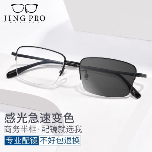 镜邦1.56感光变色镜片,内含感光因子成分,室外秒变太阳镜,既可以抵御有害蓝光,减缓度数的加深,抵御紫外线的侵害,根据光线明暗变化和紫外线的强弱,镜片颜色呈现不同程度的加深,智能切换,满足您不同场合的不同需求。超轻钛架/合金/TR镜架,轻盈纤细,半框设计简约商务与轻相伴,镜腿TR材质超大弹力,大脸不夹小脸不掉。