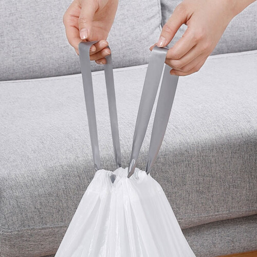 便捷抽绳设计,让双手远离脏污垃圾袋,清洁方便更舒心。 承重强,耐拉伸,兜得住,拉缇不易破,轻松提起20瓶330ML易拉罐饮料。