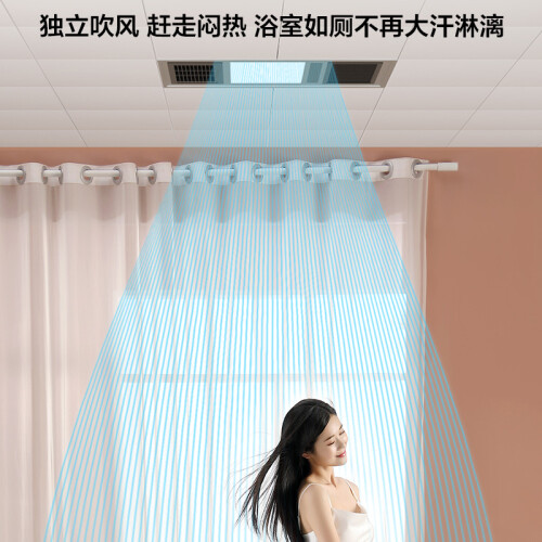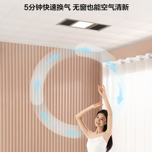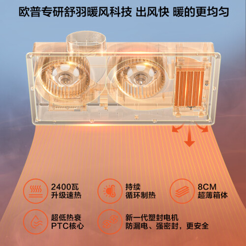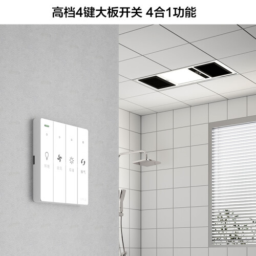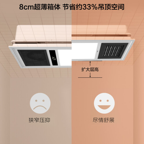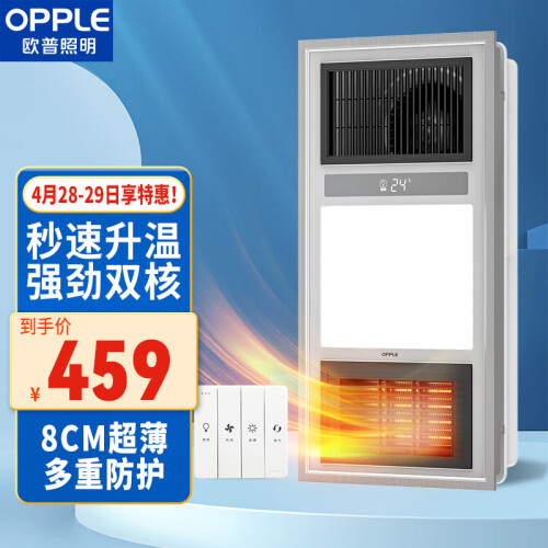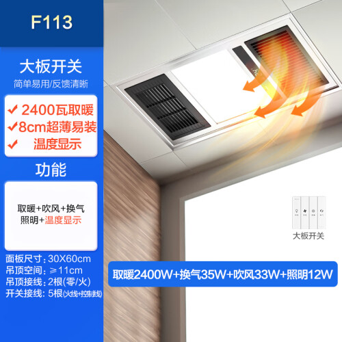 此款欧普JDSF113照明集成吊顶数显风暖浴霸,集照明、换气、吹风、取暖四大功能于一身,拥有360度循环热风设计,采用陶瓷PTC制热系统,2000W大功率发热,恒温持久。 数字显示屏,实时显示浴室当前温度。温控保护系统,能够在温度超过安全值时,自动切断电,双电机吹风换气独立运作,增强工作效率且延长了机器使用寿命。浴霸自带9W平面LED柔光照明灯,适合5-10平方的卫生间照明。浴霸尺寸30*60*17.7cm,总功率2069W,面板采用铝制,需要预留出来28cm以上的吊顶空间。此款保证阻燃效果,双腔隔离机箱,类似双层玻璃的设计,防潮,防水,防老化效果更好,更耐用。采用全塑封,防水绝缘运转时摩擦力小,更静音,耐时间损耗,使用寿命更长。环保免漆工艺,无异味,更安全。