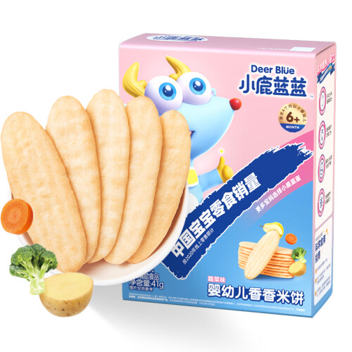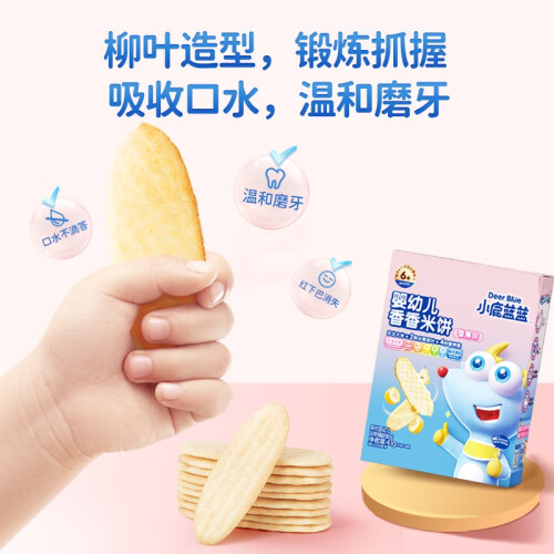 小鹿蓝蓝定位为“三只松鼠旗下互联网婴童食品专业品牌”,为中国家庭提供一站式的科学喂养方案。小鹿蓝蓝旗下产品包含辅食核桃粉、溶豆、海苔、奶酪、饼干等多款食品,产品均不含香精、防腐剂、色素、甜味剂,很好地契合了当下年轻父母对健康营养、食品安全的核心诉求。这款小鹿蓝蓝 婴幼儿磨牙饼干,优选东北绿色大米制作,米粒饱满、清白透明,,既能温和黁牙,还能吸收口水,远离红下巴,不添加食盐和白砂糖,不额外添加氧化剂膨松剂,强化钙铁锌,营养更均衡,成长发育不可或缺的微量元素,蓬松口感,自然清甜,不易掉渣,添加新鲜梨汁代替白砂糖,雪梨富含维生素,呵护宝宝敏感小肚肚。