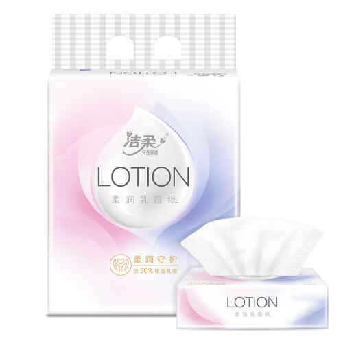 此款Lotion系列抽纸为洁柔新品,选用立体压花工艺制造,3层厚实设计,长短纤维交织处理,纸张中特别添加保湿成份,超柔软,真正一抽抵两抽,湿水更强韧,干湿两用,可做洗脸巾,先进工艺制造,即使在毛毯上擦拭也不会留下纸屑,创新开口设计,易拿取不浪费,天然原料,洁净卫生,不含荧光剂合增白剂,安全无添加。适合婴童,有鼻炎和鼻部不适人群使用。规格:3层100抽*4包 195*135mm/抽。