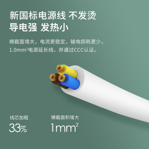 新国标电源线不发烫,导电强发热小。750℃高阻燃,大间距孔位,电流更稳定,输电损耗更少,1.0mm2电源延长线,并通过CCC认证。