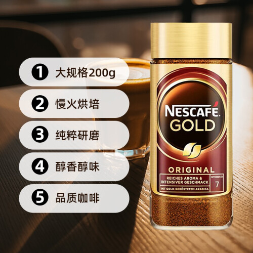 雀巢(Nestlé)这款原味金牌咖啡,选用咖啡豆、研磨咖啡为配料,每100g中蛋白质含量20.2g、脂肪2.5g、能量1470KJ。咖香浓郁具烘烤焦香风味,细腻多变,回甘明显。罐装包装,拿取方便,便于储存。保质期为18个月。