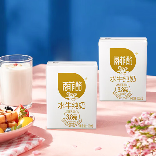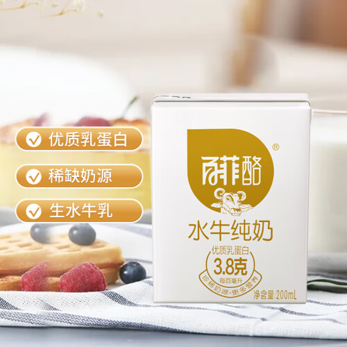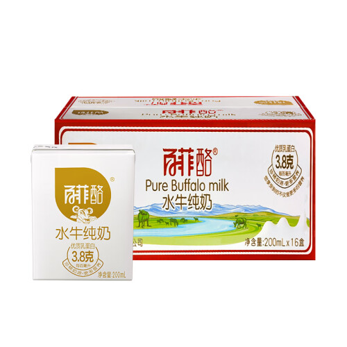 百菲酪 水牛纯奶 ,高达3.8克的蛋白质,有助于人体组织的形成和生长,补充蛋白质,1.3倍的钙、3倍的氨基酸和数十倍的微量元素、维生素,却只有一般牛奶的1/5的胆固醇,更香、更醇、更营养。规格:200ml*16盒。