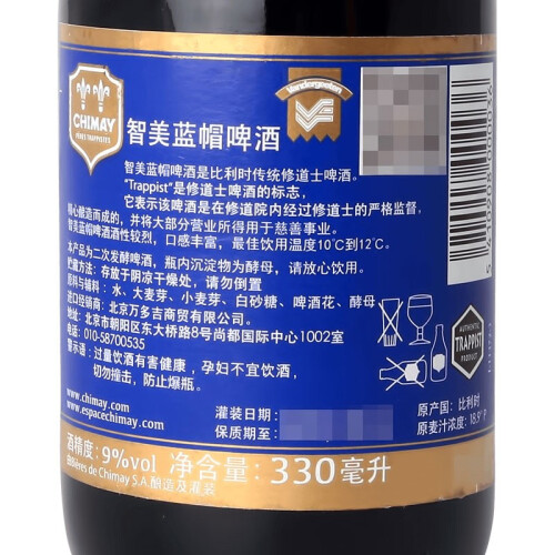 Chimay智美是“Trappist”啤酒中销量最高的品牌。在智美的生产线中依据口味和酒精度从低至高分为黄帽、红帽、白帽和蓝帽。蓝帽是常规智美啤酒中口味最重香气最复杂的一款(过桶的更重)。它所使用上层发酵法酿造,其啤酒特点是口味强烈,度数高而且还苦。它通过手工酿造,并且在瓶内还经过2到3此的再发酵。