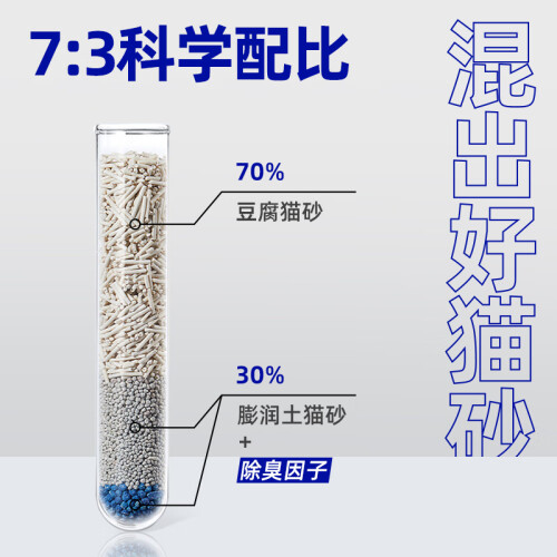 无需烦恼垃圾分类,7:3配比可倒入马桶,70%豆腐猫砂和30%膨润土猫砂混合,避开豆腐猫砂结团不好,膨润土猫砂易带出缺点,又可以发挥豆腐猫砂可倒入马桶的优点。