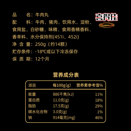 喜得佳 牛肉丸 个头相对比较普通款的大,确保肉汁的保留与口感的弹性,肉质结实细嫩,入口弹牙有嚼劲,规格: 250g