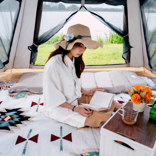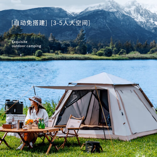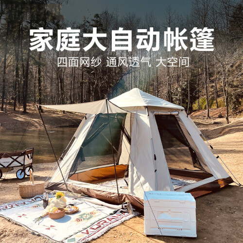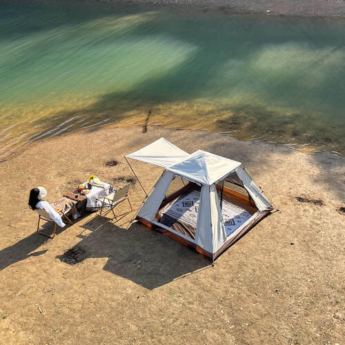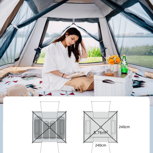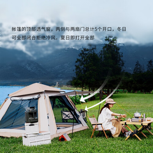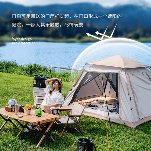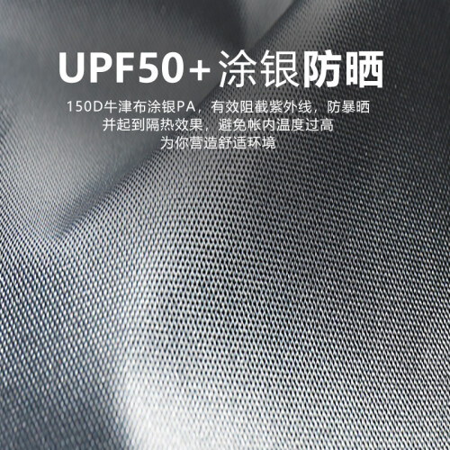 加厚双层涂银,隔热量防晒,高效防晒做你的户外防晒衣。自动速开支架免去搭建烦恼,提一拉女生轻松开收帐,享受毫不费力的露营。选用PU210T涂银防晒面料,结合细密PU防泼水涂层,具备荷叶拒水效果,满足短暂防雨需求。