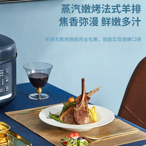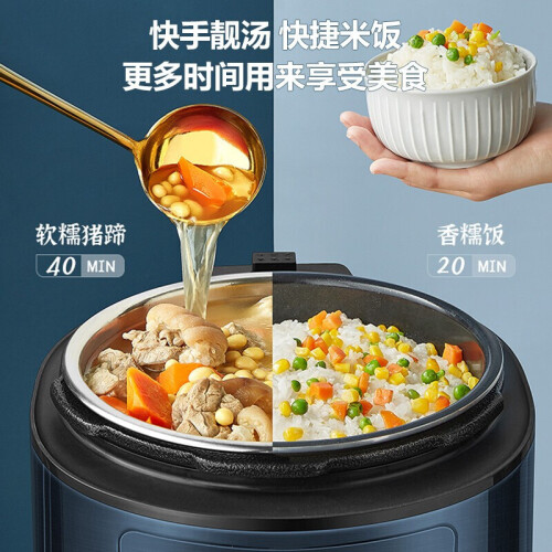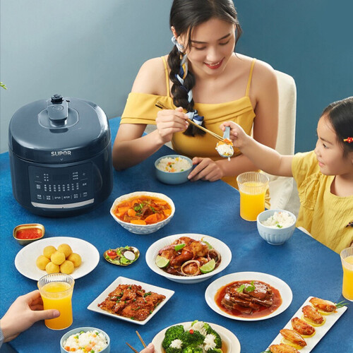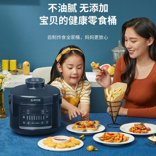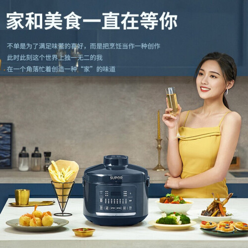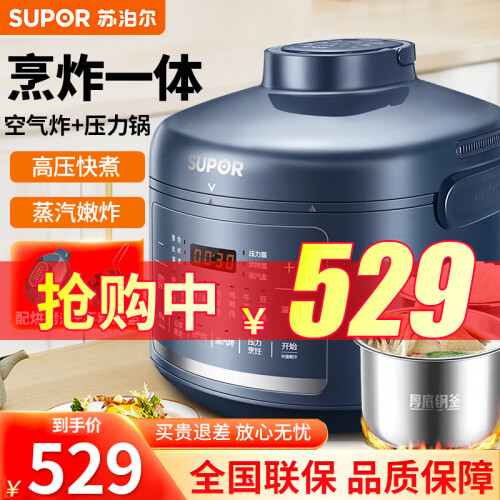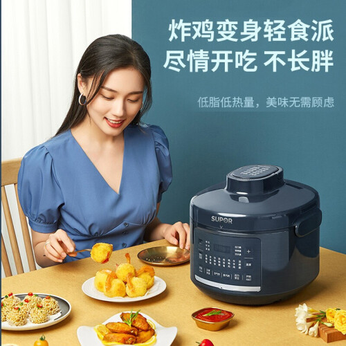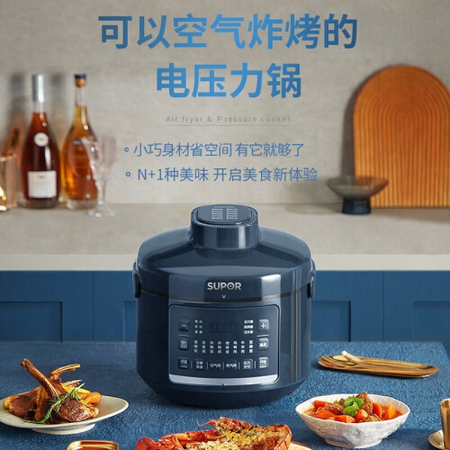 苏泊尔这款型号为SY-50FB8093的电压力锅,容量为5L,同时具备空气炸烤的功能,内置10叶强劲风扇,实现360°热风循环;配备独立蒸汽发生盒,蒸汽不仅能保持锅内湿度,既能达到高温烤制目的,又能改善食物干柴口感;70kPa高压快煮,并能够智能匹配适宜压力,在0-70kPa之间自动调节压力;配备双内胆,包括304厚底钢釜以及陶晶内胆;上盖可拆卸,清洁方便;压力锅功率1000W,烘烤功率1600W。